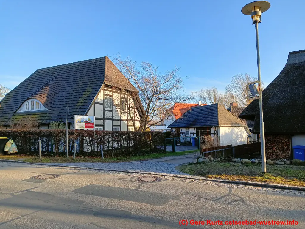Von Ahrenshoop aus kommend an der Wustrower Kirche vorbeifahren und die nächste Straße (Kuhleger) nach links. Gut zu erkennen, weil an der Straßenecke ein großer Spiegel steht.