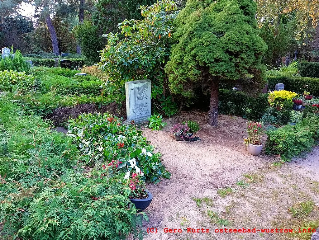 Auf dem Fischländer Friedhof haben viele bekannte Menschen ihre letzte Ruhestätte gefunden. An der Kapelle steht eine große Tafel mit einem Lageplan des Friedhofs und auch mit Hinweisen zu den Gräbern einiger bekannter Persönlichkeiten. Leider ist die wirkliche Lage oftmals schwer zu finden. Deshalb werde ich versuchen, durch genaue Positionsangaben die Suche etwas zu vereinfachen. Wichtig ist, dass auf der Tafel nicht die Grabreihen nummeriert sind, sondern die Wege. Diese beginnen rechts vom Haupteingang mit der Nummer 1. Damit man dies besser sehen kann, liegen an vielen Wegen Steine mit der entsprechenden Nummer.